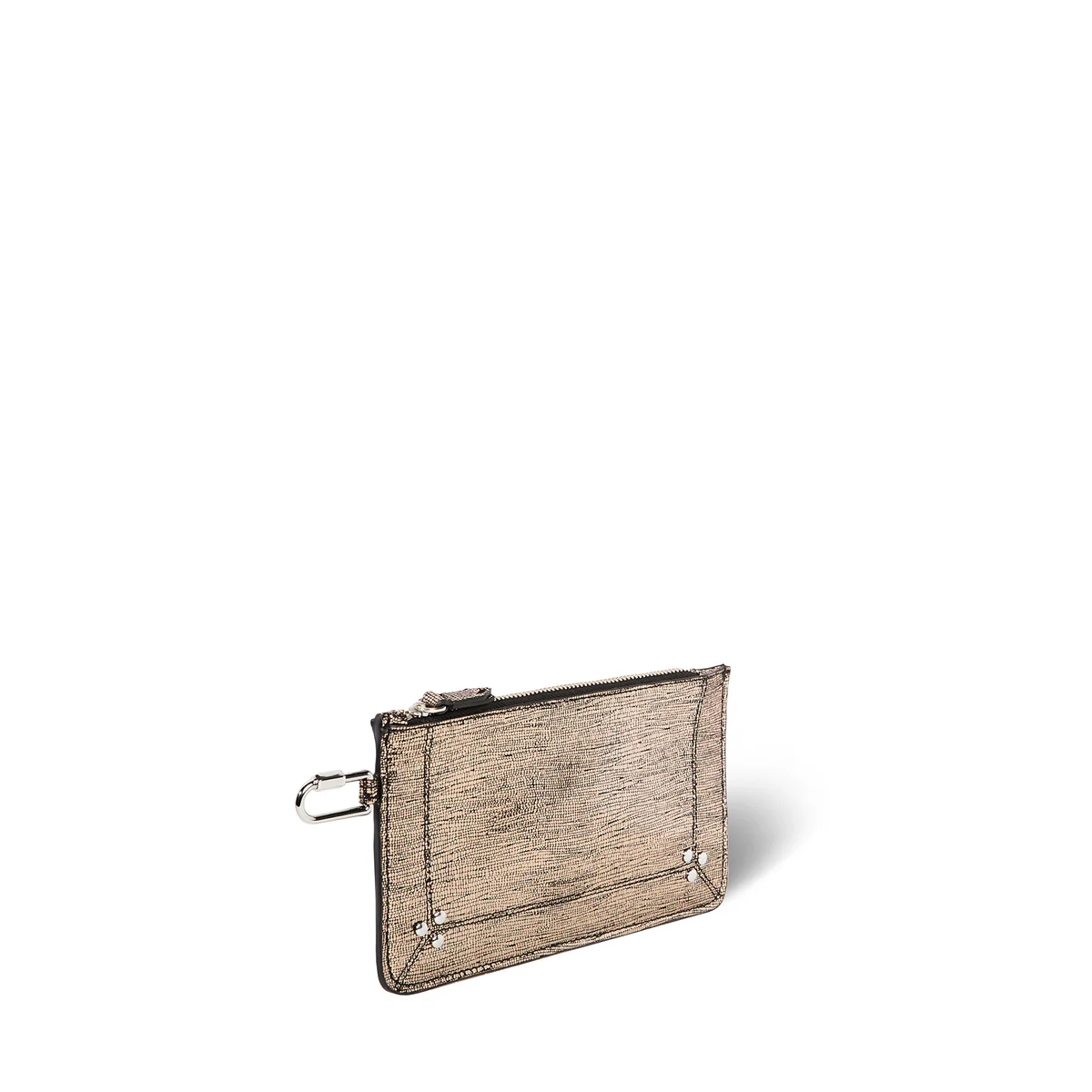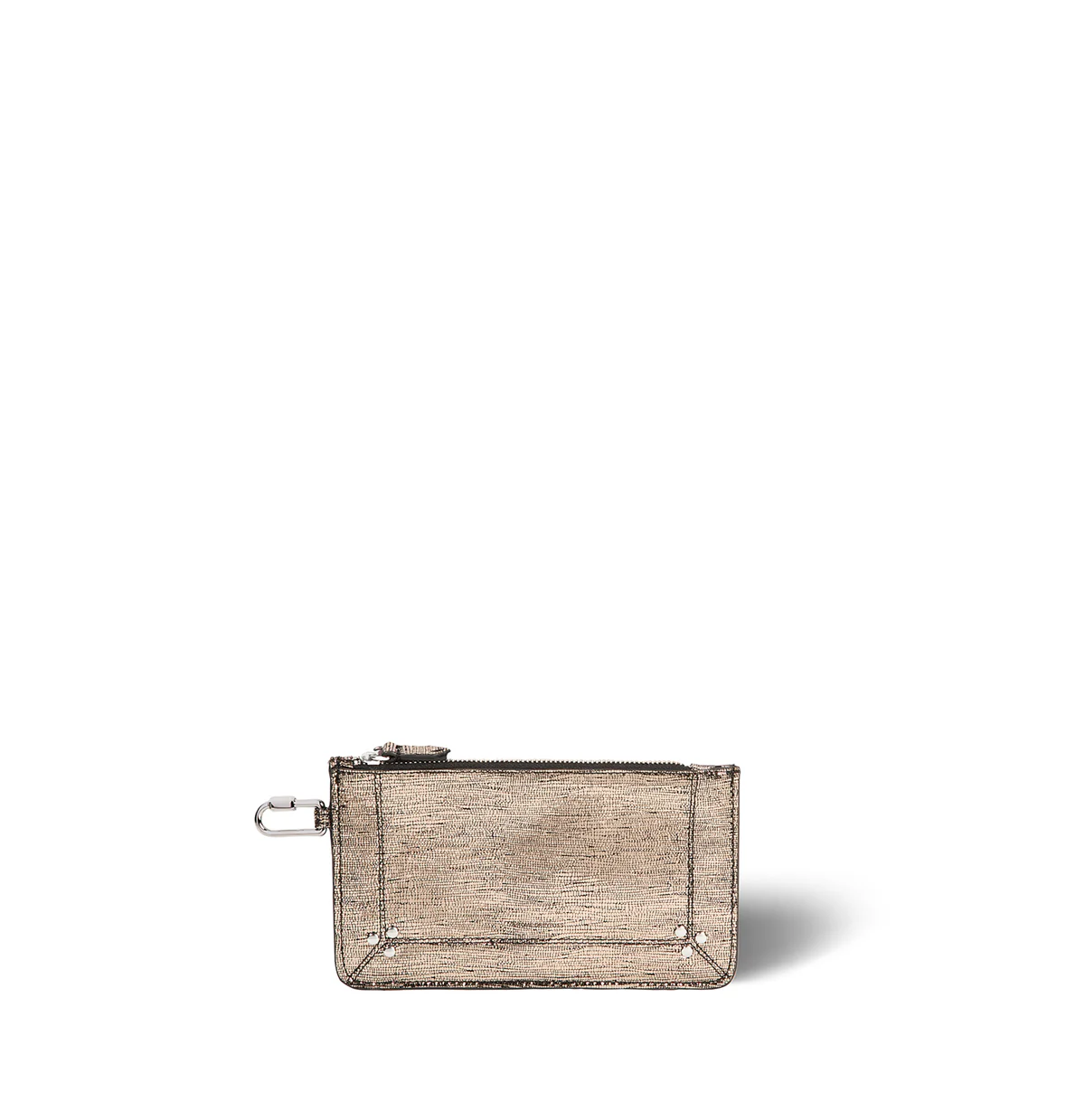 Fermeture entièrement zippée. Anneau à vis pour l’accrocher au mousqueton présent dans les sacs de la Maison.